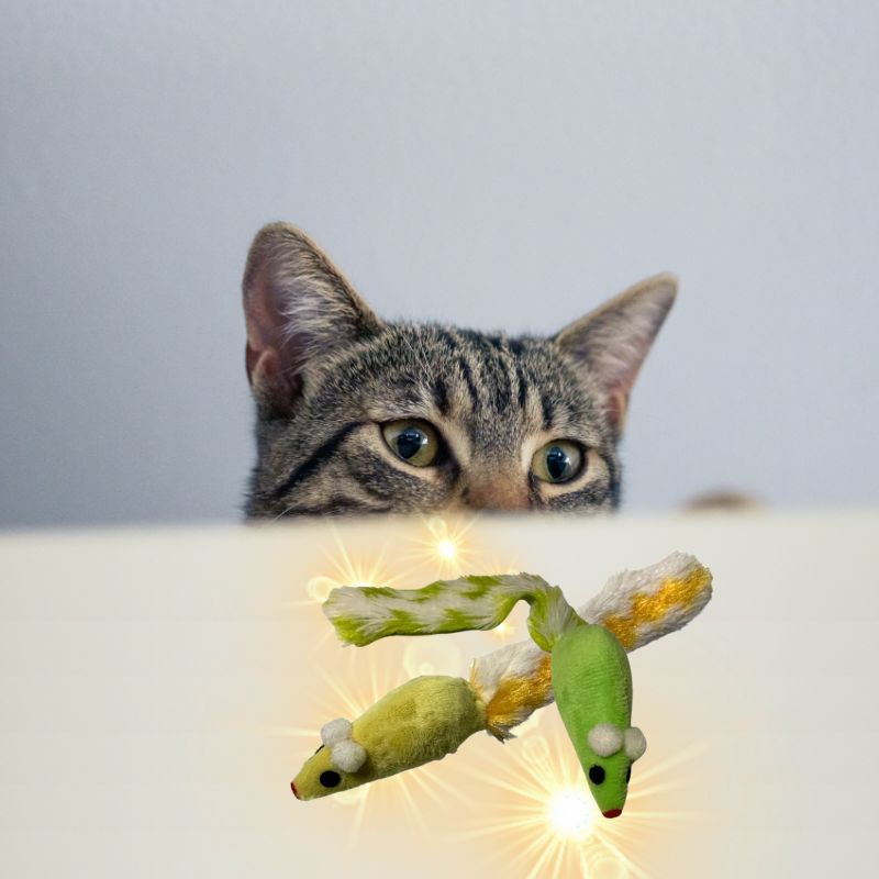 Ce jouet souris en peluche avec une queue poilue et bruyante en mouvement est disponible en vert ou jaune.